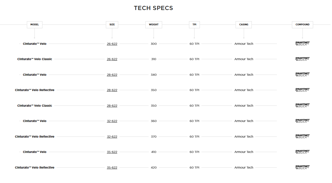Предишният опит на Pirelli и надеждността на технологията SmartNET™ Silica, съчетани с безкамерния комфорт и устойчивостта на технологията Armour Tech™, улесниха създаването на нова гума с уникално ДНК - идеална за дълги разстояния и различни терени. Конструкцията Armor Tech™ съчетава слой с висока плътност Nylon bead-to-bead с арамиден прекъсвач и арамидни влакна, разпръснати в протектора, което води до ново ниво на защита срещу най-лошите пътни условия, което никога не е било постигано досега. SmartNET™ Каучуковата смес от силициев диоксид гарантира безопасно каране и вдъхващо увереност управление дори при тежки условия. Размери от 26-622 до 35-622 правят тази гума лесна и бърза за употреба и винаги готова за каране на Granfondo, както и за дълги приключения на велосипед. Всичко в конфигурация с тръба и/или безкамерна конфигурация Cinturato Velo TLR е съвместима с джанти без куки според ETRTO 5bar/73psi максимално ограничение на налягането.